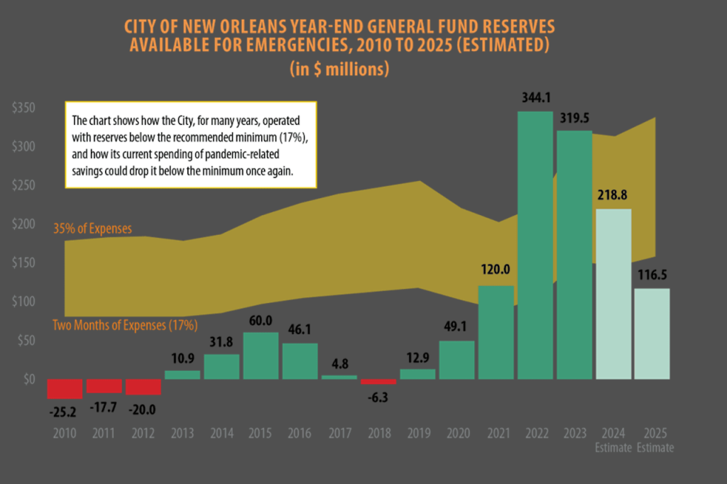 A key to achieving a sustainable budget is to maintain adequate reserves to help avoid cuts to essential services and increases in taxes or fees during financial emergencies. Government finance experts recommend that municipalities maintain at least two months of expenses in reserve, or about 17% of their general fund operating budgets. Experts say disaster-prone cities such as New Orleans should consider a higher level. As shown in the attached chart, the City’s reserves skyrocketed from just $13 million before the pandemic to a high of $344 million in 2022. But three years of spending from the reserves could reduce them below the minimum recommended level of $133 million by the end of this year.