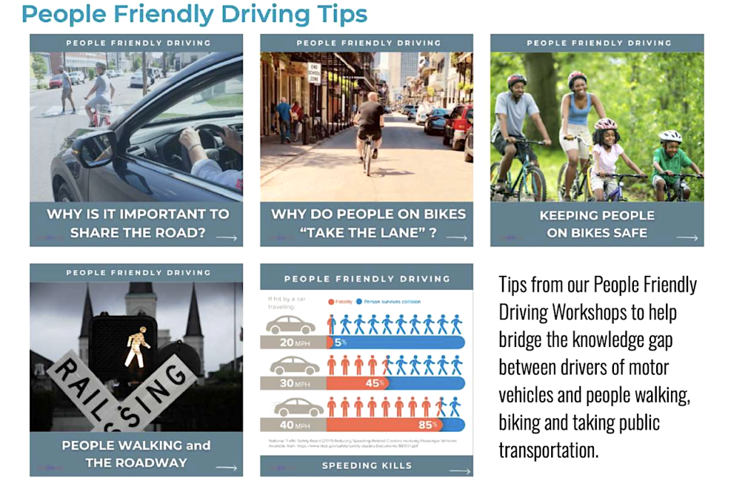 People Friendly Driving outreach also expanded during the year through new partnerships with nationwide driving schools and New Orleans Hop-On Hop-Off tour drivers, training both professional and everyday drivers on traffic laws, visibility, safe passing and best practices for sharing the road with people biking and walking.
