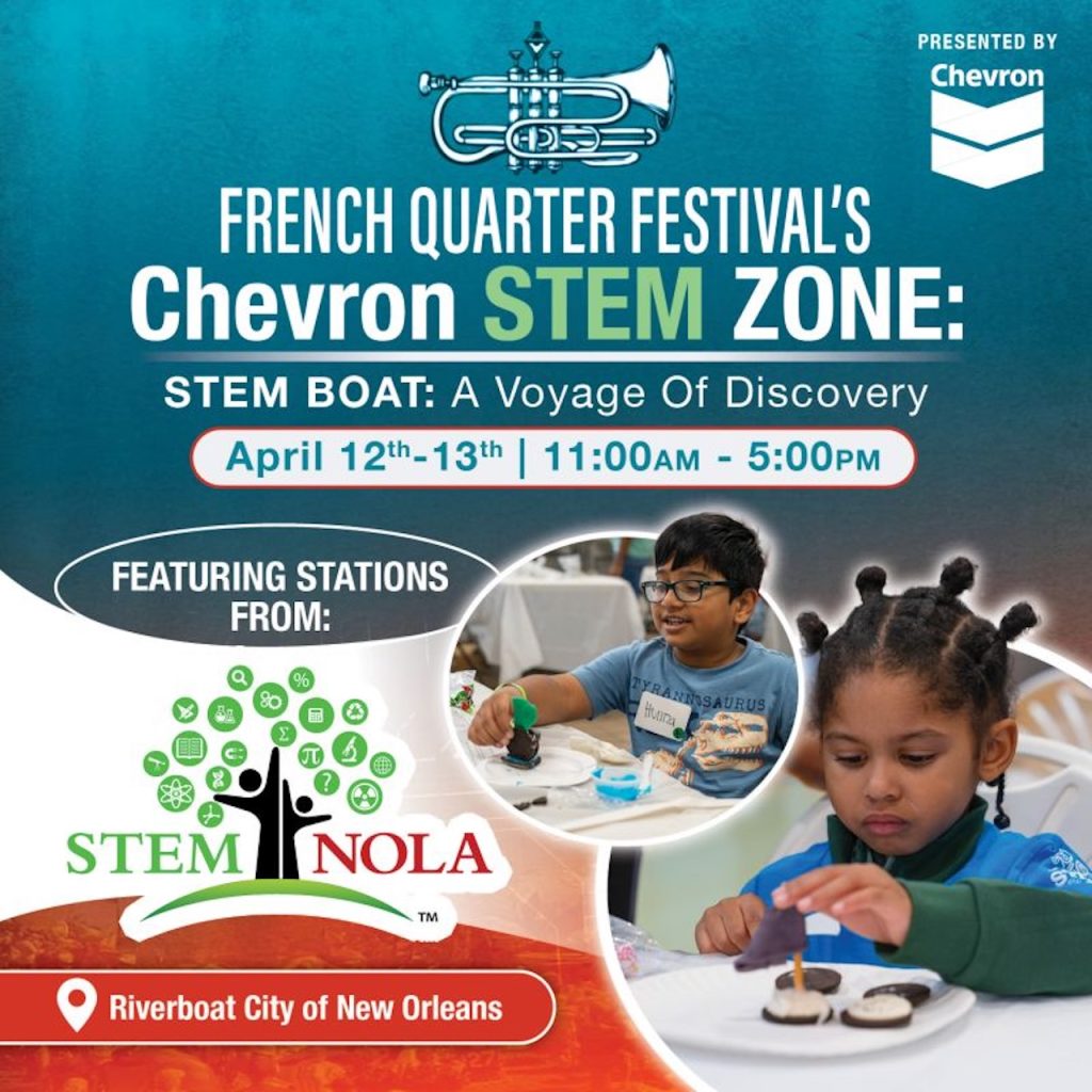 “STEM NOLA is proud to collaborate with Chevron to bring hands-on, STEM-based learning to the community through the Chevron STEM Zone: “STEM Boat: A Voyage of Discovery” at the French Quarter Festival,” said Jim Pittman, Chief Communications Officer, STEM NOLA.