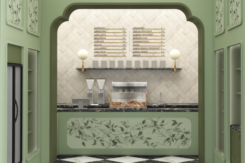 Fifi Parée is designed to evoke the charm of a Parisian flower shop, featuring hand-painted floral murals, black-and-white marble flooring and deep green accents throughout.