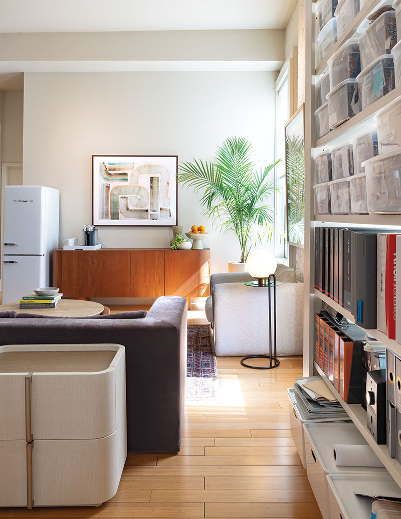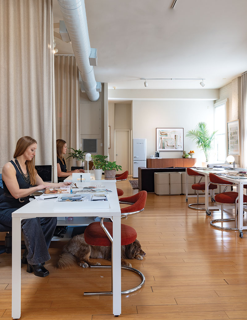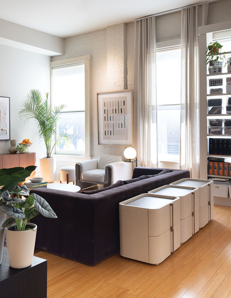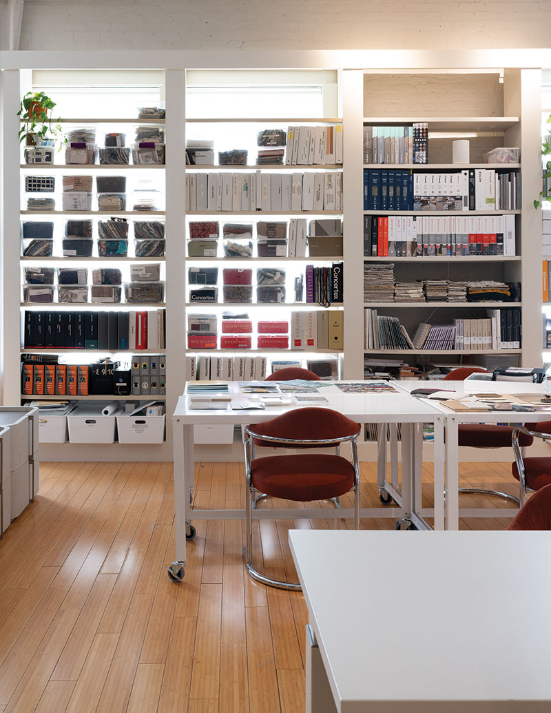 “Our goals were to design a collaborative and multifunctional space that included areas of productivity as well as areas for quiet, while preserving the abundance of natural light,” Ferrand said. “We decided to paint the walls a warm white to give an overall lightness and warmth, and we have space-planned so that these areas can co-exist. When designing the design library, we chose to do a larger custom millwork piece that was backless to allow light to filter through. [We also designed] custom drapery and shades for light control.”