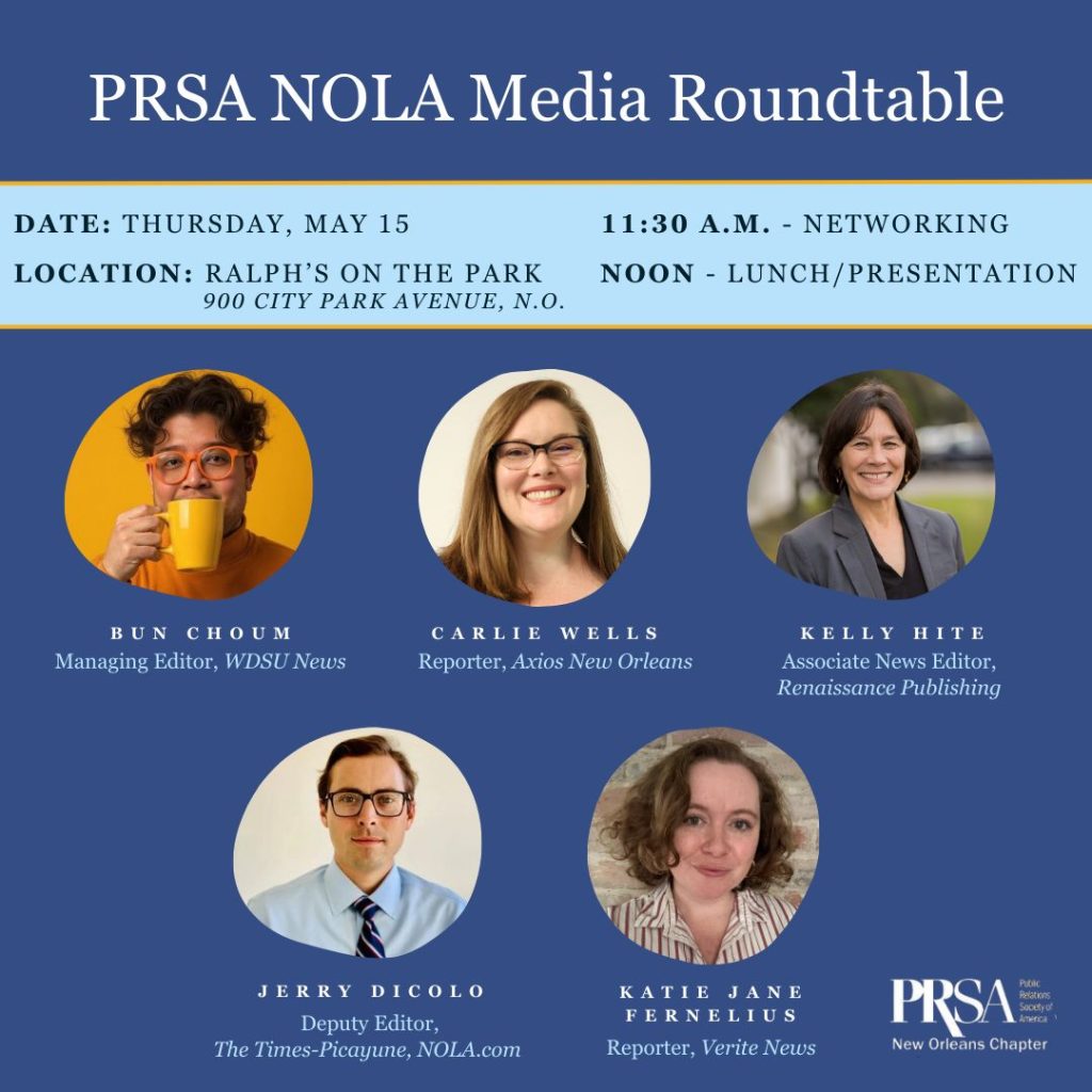 NEW ORLEANS (press release) – The New Orleans Chapter of the Public Relations Society of America (PRSA) will present an interactive panel discussion Thursday, May 15 featuring prominent New Orleans media professionals. This unique workshop is designed to equip business owners and communications experts with actionable strategies for effectively navigating today’s dynamic news environment and insider tips on how to best secure valuable media coverage.